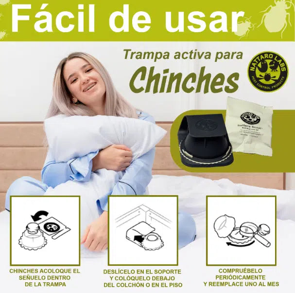 La trampa para chinches de cama es muy útil para eliminar a los animales rastreros como los chinches gracias a su atrayente natural patentado basado en feromonas naturales. Está compuesto por una mezcla única de feromonas de chinches de cama que simula el olor de un escondite o agregación de chinches de cama. El aroma atraerá a todas las etapas de chinches de cama vivas que puedan estar en la habitación, es decir, hembras, machos y las diferentes etapas de ninfas. Las chinches de cama pueden trepar hasta la trampa, pero no pueden salir. Una vez dentro, quedan atrapadas.